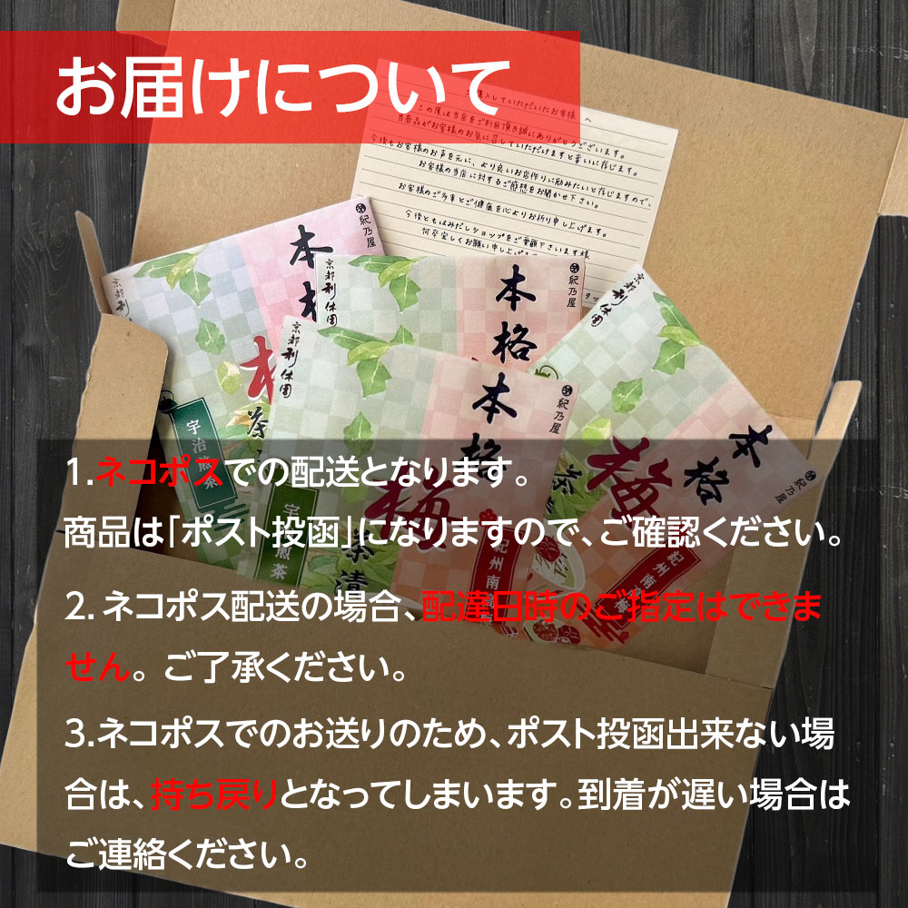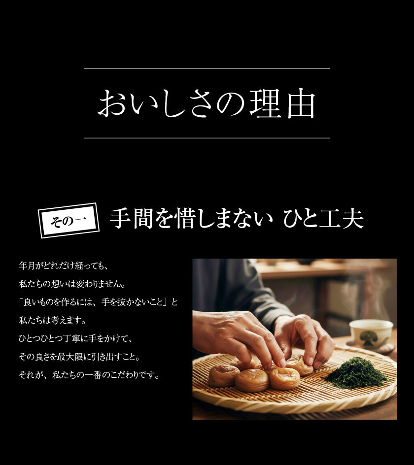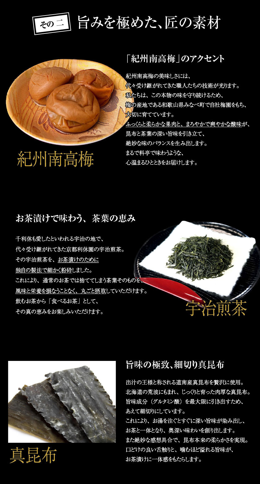 原材料名 | 《調味梅干し》梅(紀州)、漬け原材料(食塩、醸造酢、はちみつ、酵母エキス)/調味料(アミノ酸等)、スクラロース、VB₁《お茶漬けの素》醤油(小麦・大豆を含む、国内製造)、昆布、茶葉、清酒、砂糖、還元麦芽糖 / 調味料(アミノ酸等)、重曹、甘味料(甘草) |